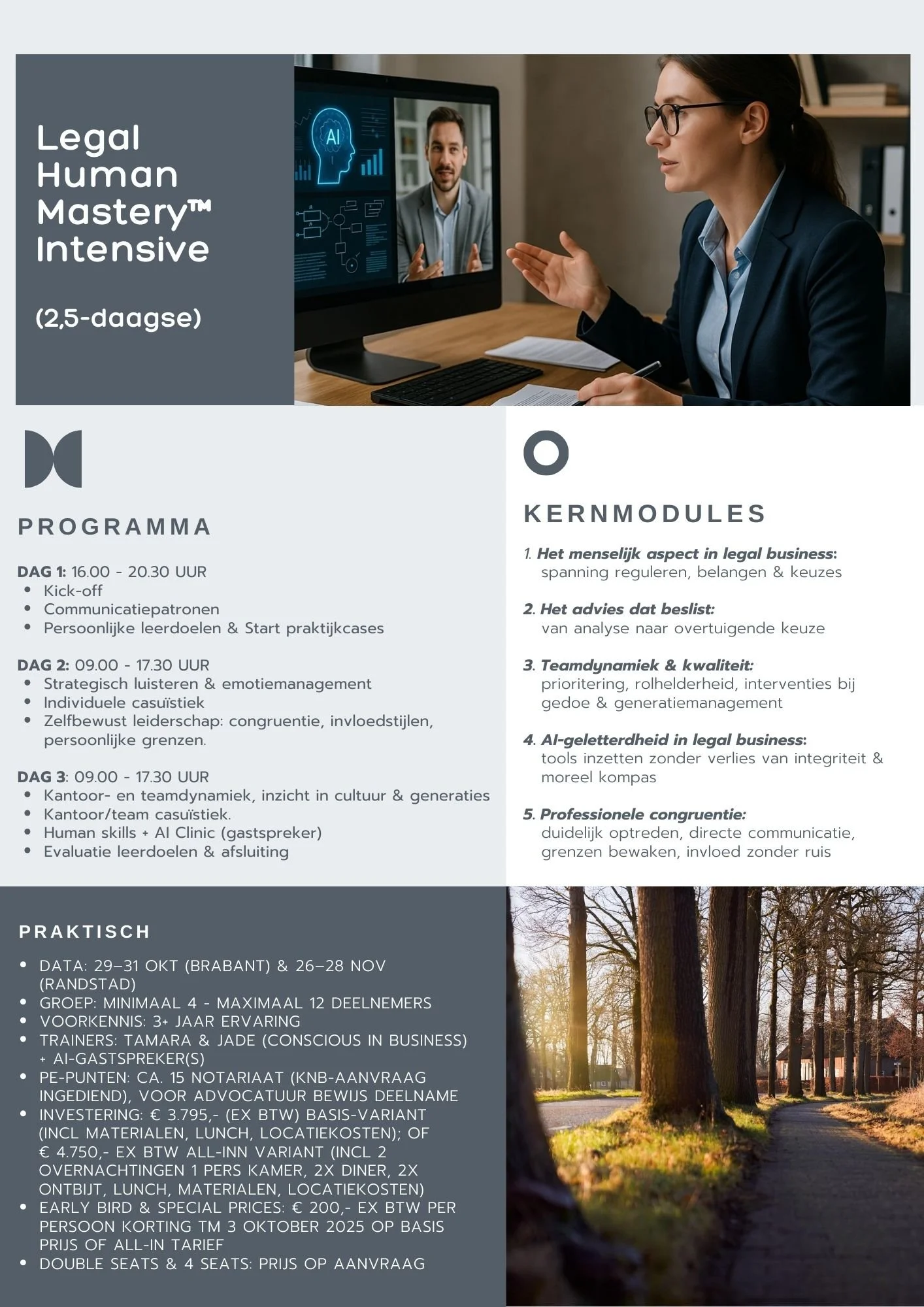 Conscious in Business organiseert Legal Business Days - intensieve 2,5-daagse trainingen voor juristen waarin je in één keer bijna al je jaarlijkse PE-punten (KNB & NOVA) behaalt. Tegelijkertijd versterk je je communicatieve vakmanschap, leiderschap en AI-bewustzijn, zodat je niet alleen voldoet aan je scholingsplicht maar ook toekomstbestendig werkt.